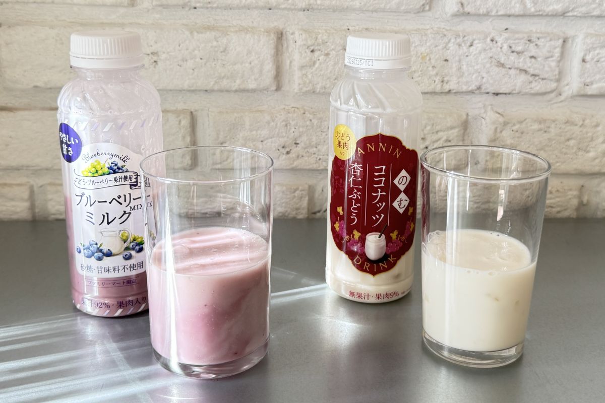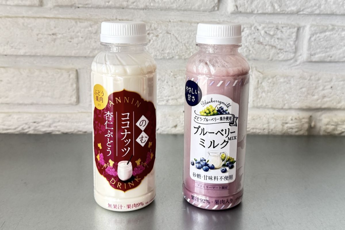 右が「ブルーベリーMIXミルク」295円、左が「のむココナッツ杏仁ぶどう」298円。