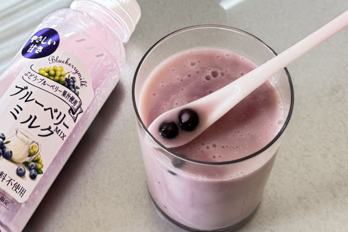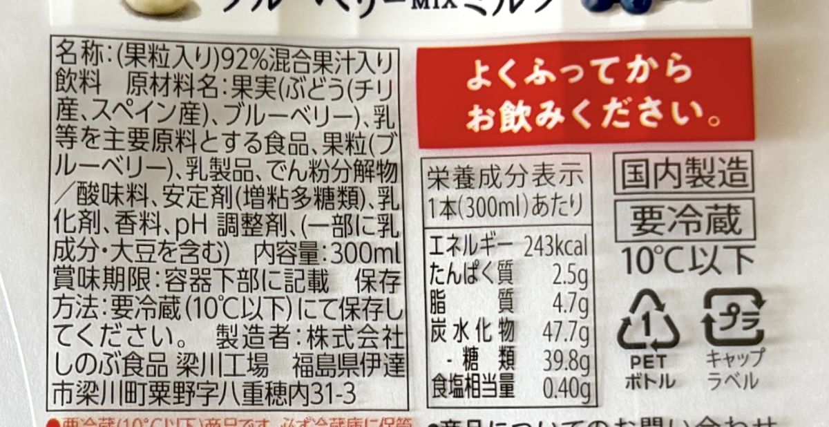 ブルーベリーの果肉は、ボトルの底に沈みがちなので、よく振ってから飲みましょう。