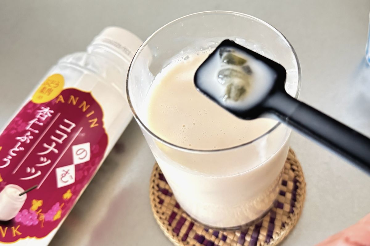 「のむココナッツ杏仁ぶどう」は、開栓すると杏仁特有のフローラルな香りが立ち上ります。