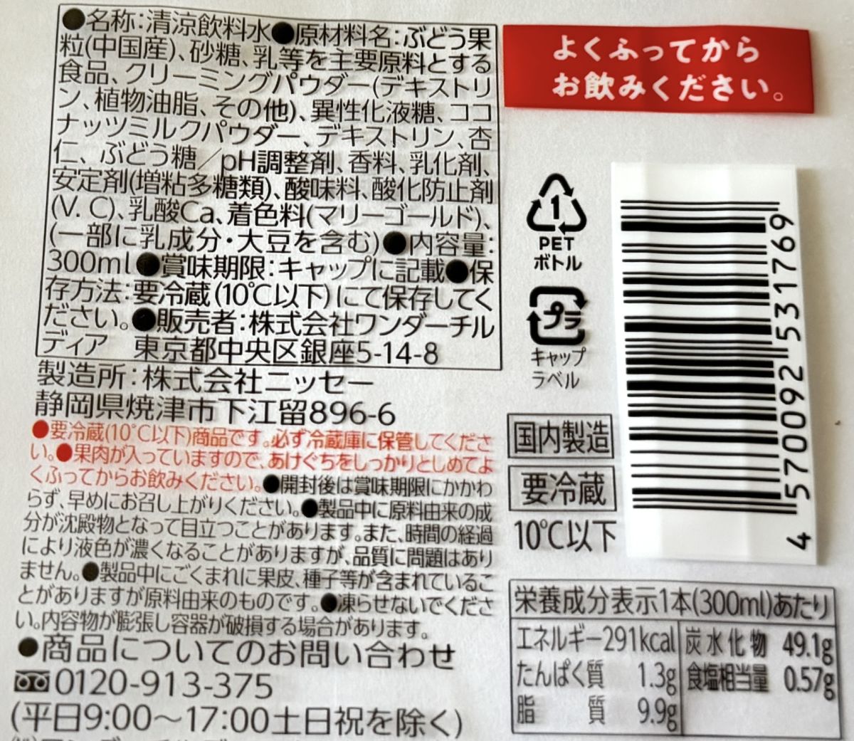 気になるカロリーは1本(300ml)あたり291kcalです。