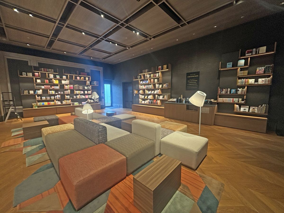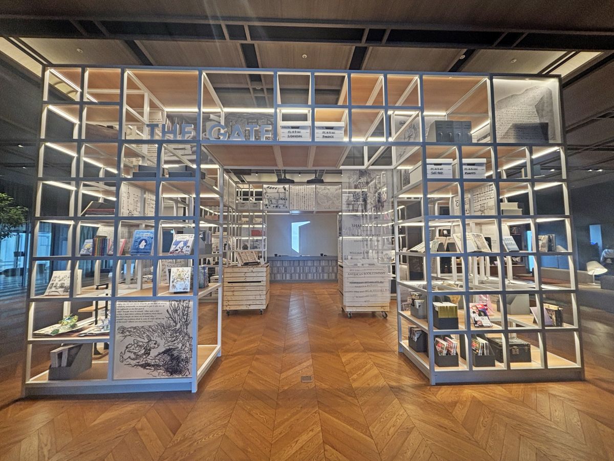 エレベーターを降りて最初に目に入ってくるのが「the gate」。「知識と想像が交差する場所」というホテルコンセプトを体現した空間に、普段あまり目にすることのない稀少本や大型本、全集など、少々マニアックな本が並びます。