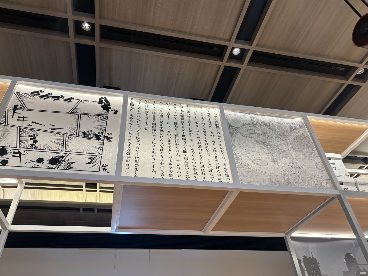 よく見てみると、漫画のコマや小説の一節などをあしらったユニークなデザインが散りばめられています。本の世界へ足を踏み入れる入り口のようでワクワクします!