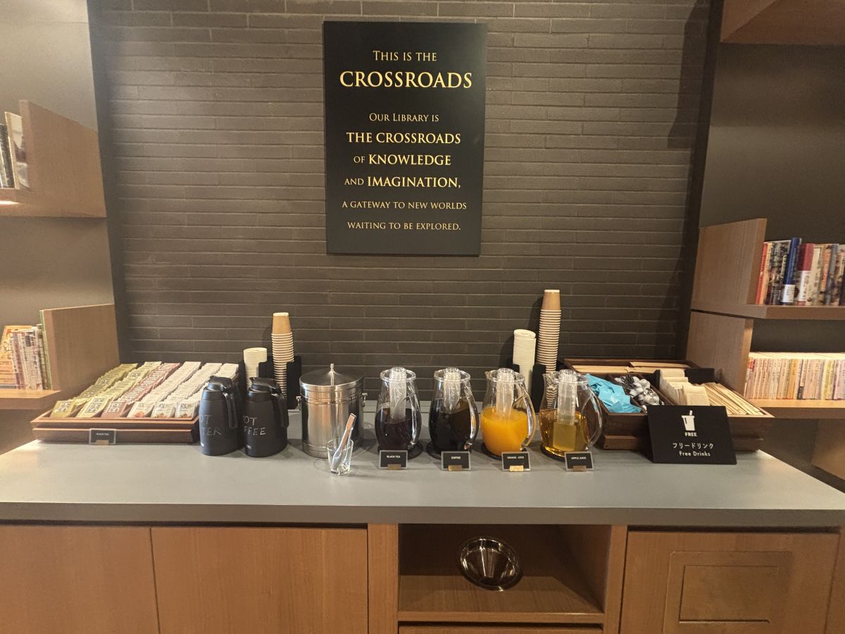 「the crossroads」には、コーヒーや紅茶、オレンジジュースなど豊富なラインアップが並ぶドリンクバーもあります。宿泊者が24時間自由に楽しむことができて、「the Library」内でいただくのはもちろん、お部屋に持って行くこともできます。