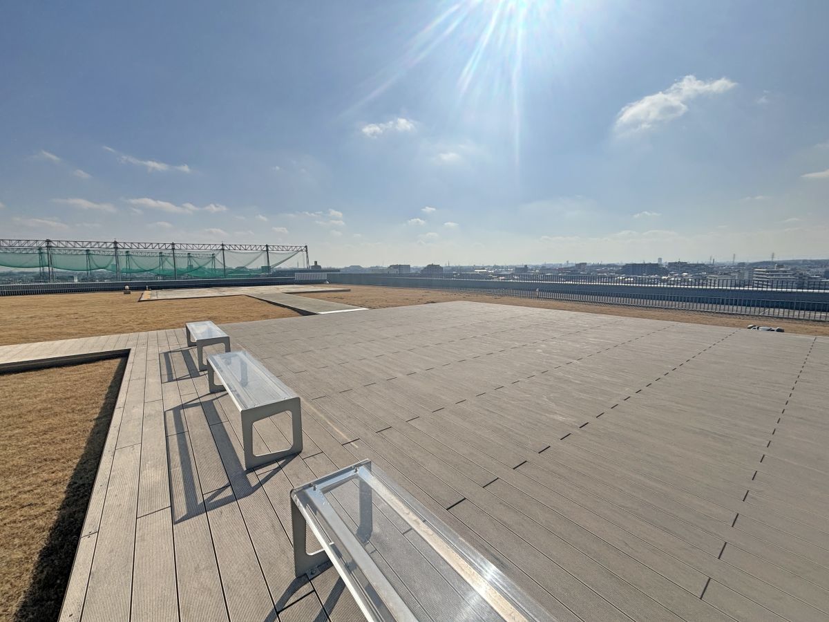 ちょっと気分転換したくなったら、所沢の街並みを一望できる屋上庭園に行ってみるのがおすすめ。天気がよい日の夜には、満天の星も見られます。取材時は晴天で、澄み渡った青空をひとり占めすることができました。