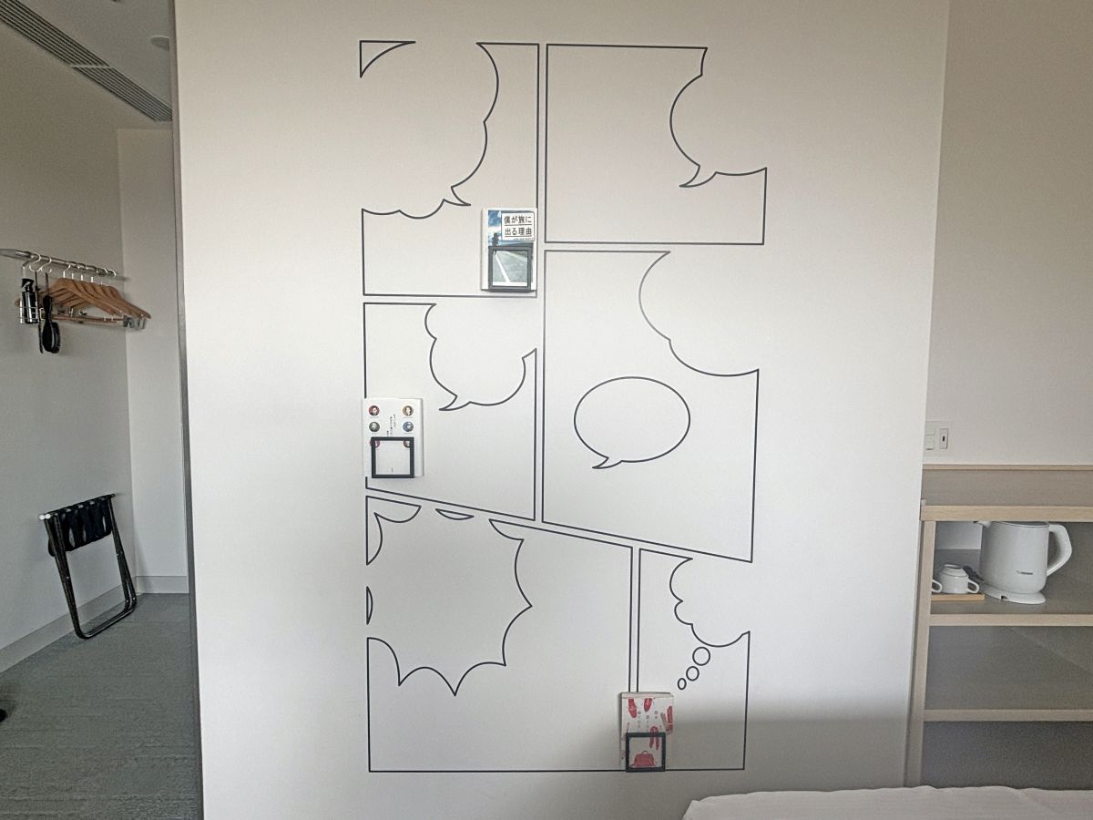 お部屋の中でひときわ目をひくのが、漫画のコマがデザインされたウォールアート。ここにはジャンルが異なる3冊の本が飾られていて、もちろん自由に読むことができます。普段選ばないジャンルとの偶然の出合いも、このホテルならでは。