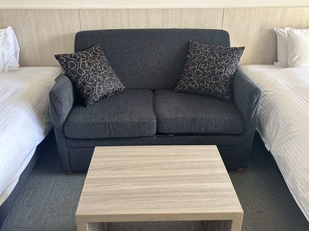 部屋の真ん中には、読書にぴったりなソファも。ソファの目の前の壁にはYAMAHAサウンドバー(スピーカー)付きの大きなテレビもあるので、テレビ視聴や映画鑑賞もおすすめです。映画を楽しんだ後に、原作の小説をじっくり読むという過ごし方もできちゃいます。
