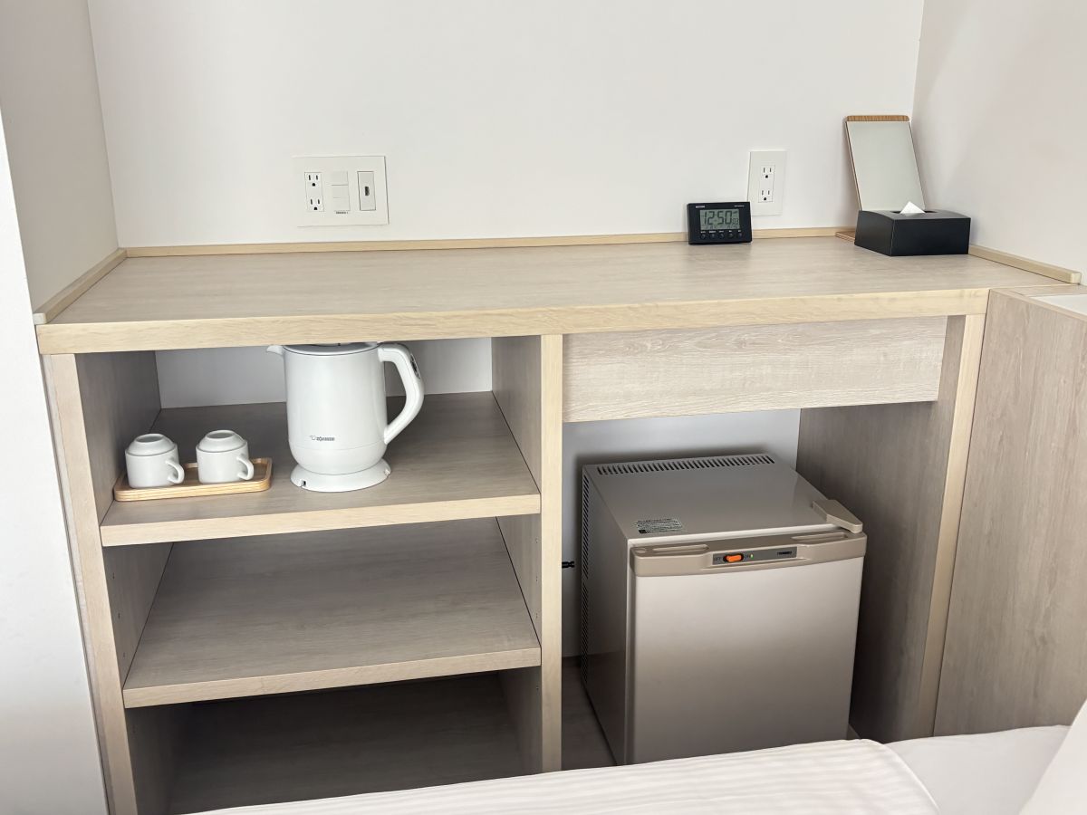 ポットやカップ、冷蔵庫はベッドの横の棚に用意されています。コンセントも豊富なので、充電するものが多いときでも安心。