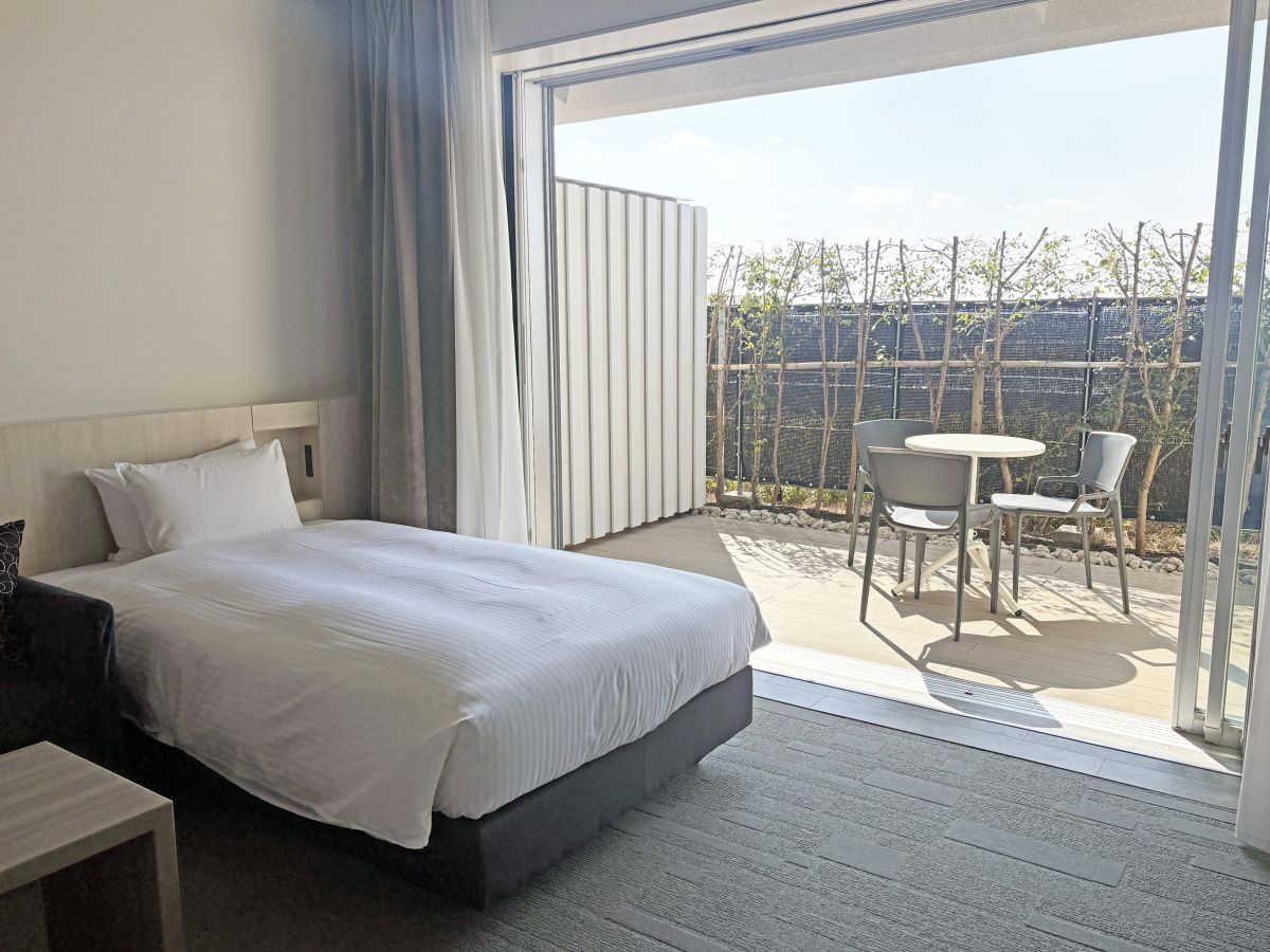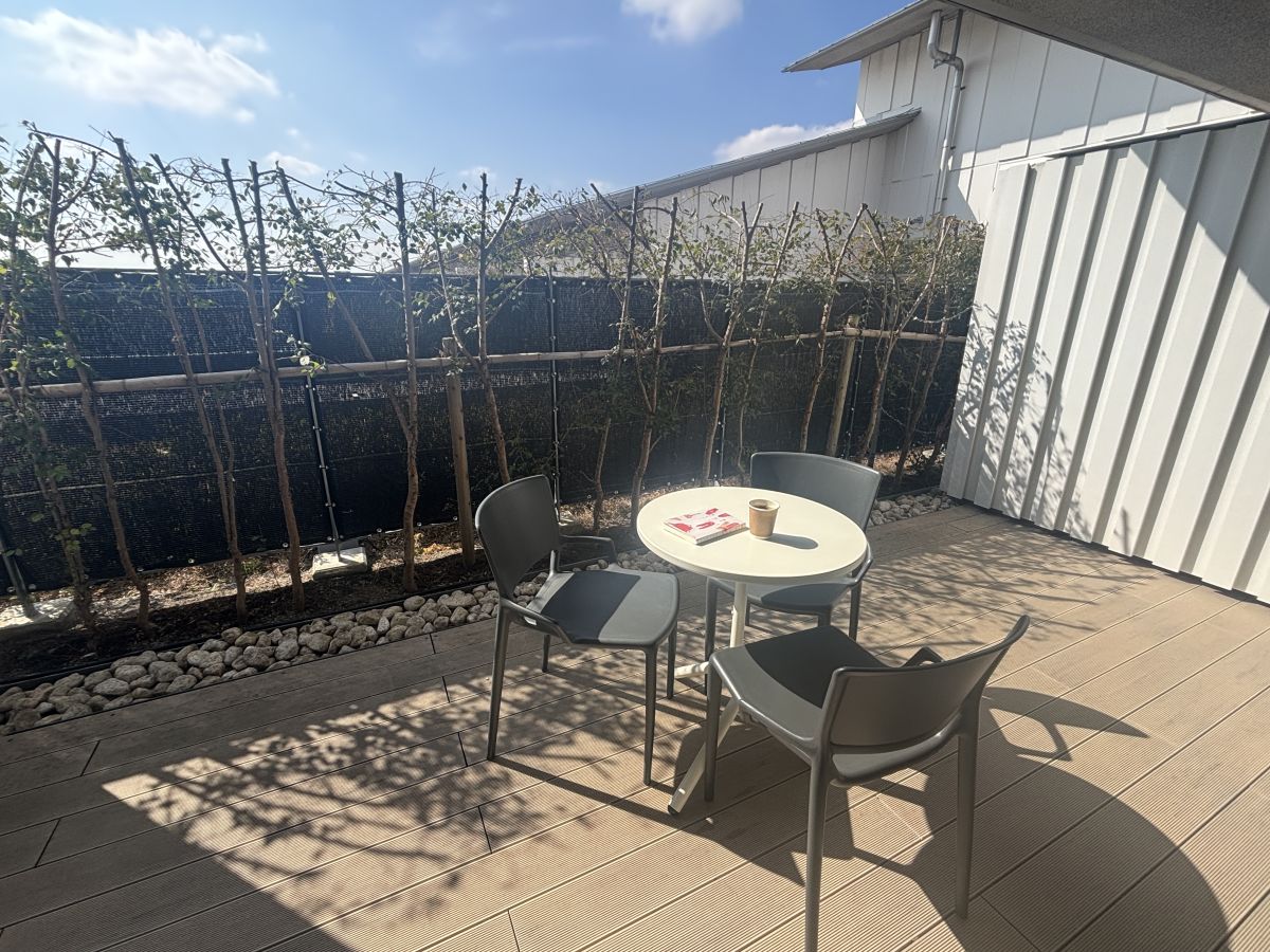 「IN THE LIBRARY hotel and books TOKOROZAWA」の魅力のひとつが、全客室にテラスが完備されていること。鳥のさえずりが聞こえてくるおだやかな空間はとても居心地がよく、ついつい長居してしまいます。