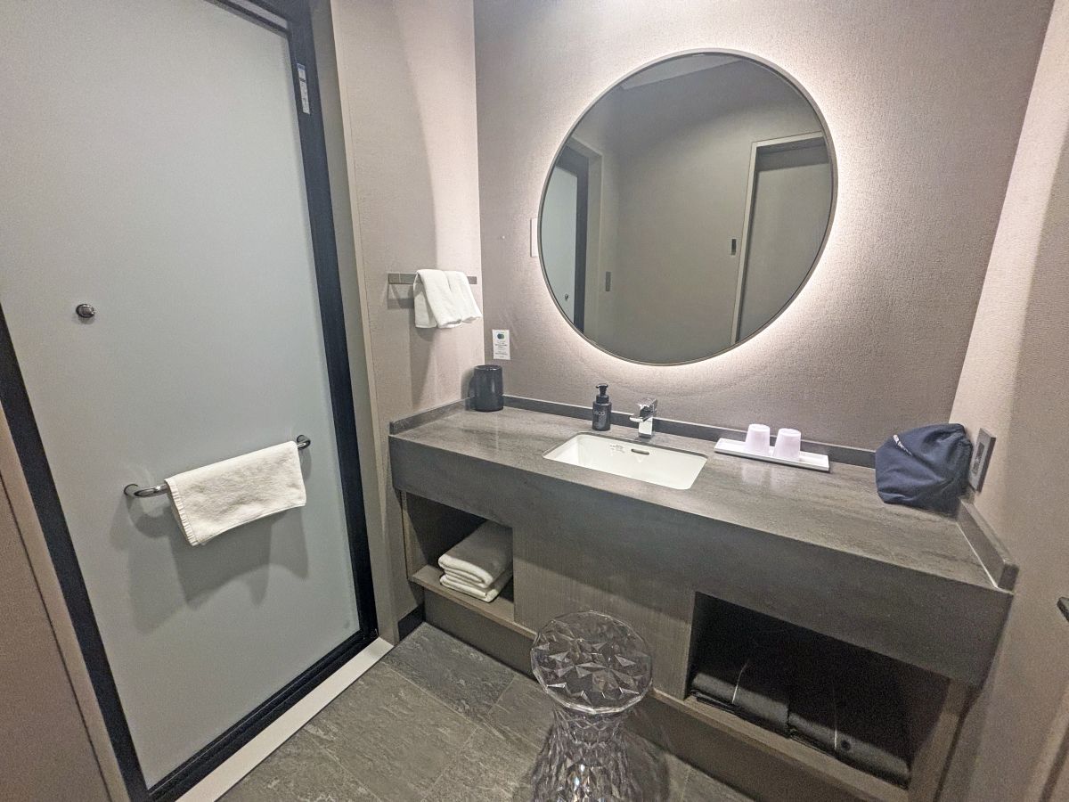 洗面所は広々としていて、朝の身支度も快適にできました。スツールがあるのもうれしいポイント。タオルやパジャマはシンクの下の棚に用意されています。