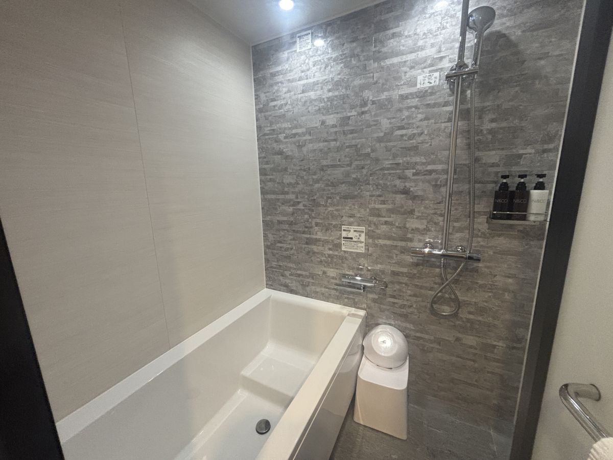 シンプルで機能的なバスルームには、ハンドシャワーに加えてオーバーヘッドシャワーも。浴槽は大人1人が足を伸ばしてくつろげるほど広々としていて、読書で満たした1日を、ゆったり湯船で締めくくれます。