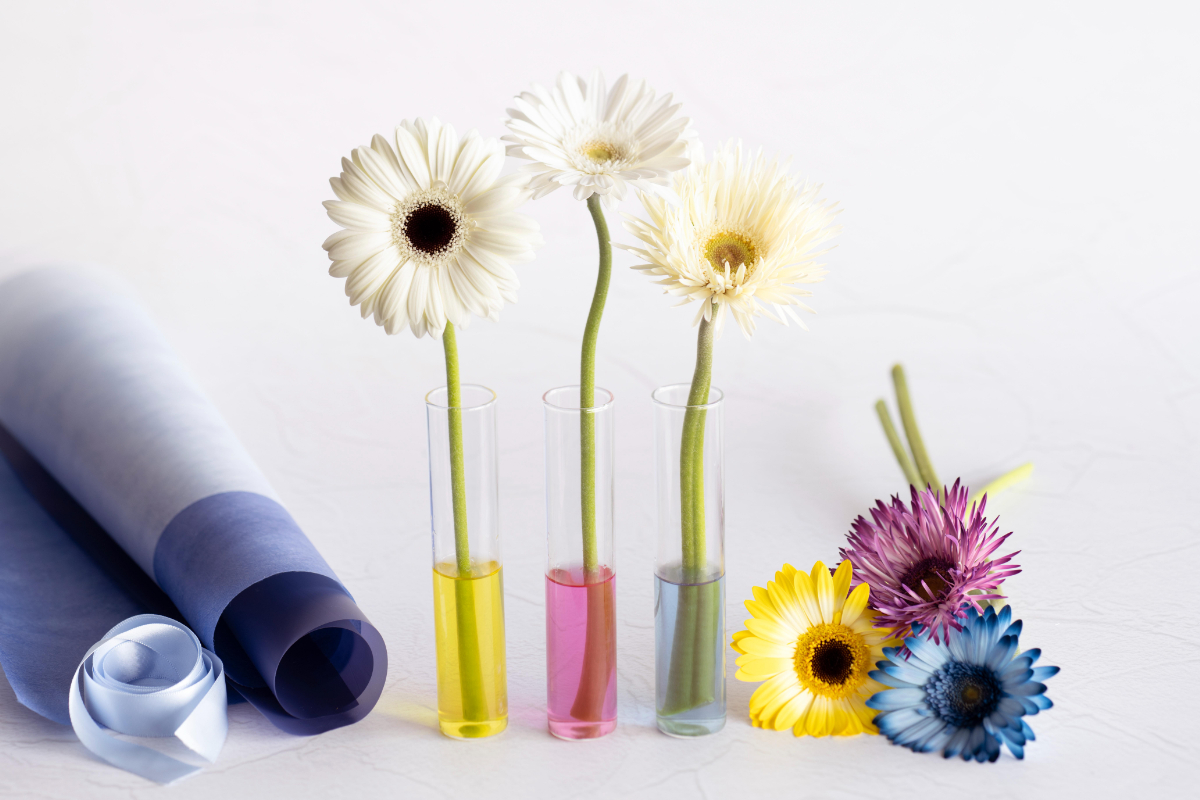「天空の花咲くリゾナーレ」では、ガーベラの染色体験も楽しむことができます。数種類のガーベラから1輪を選んで、好きなカラーに染め上げます。