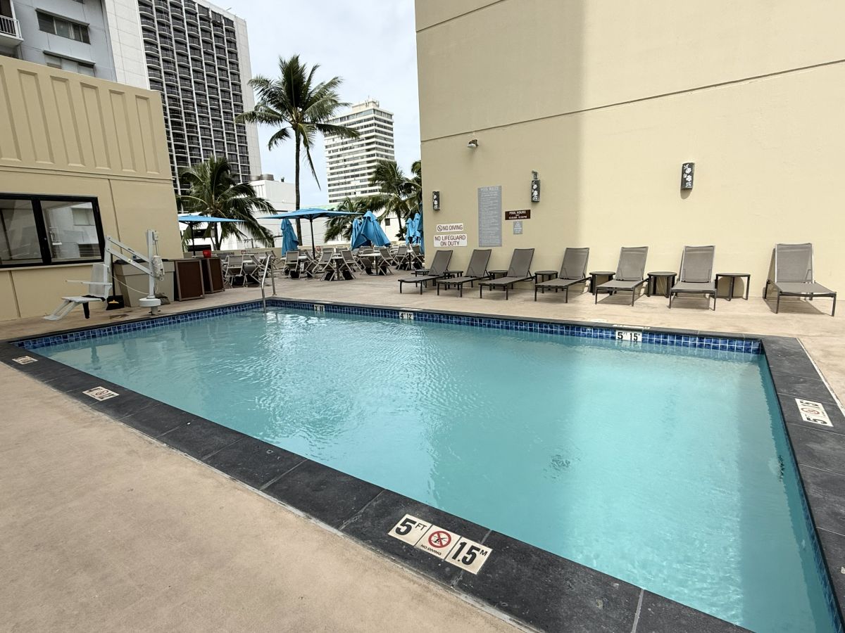 3階には、宿泊者が利用できるプールがあり、観光の合間にリラックスした時間を過ごすことができます。ワイキキビーチが近いとはいえ、混雑を避けてゆっくり泳ぎたいときにはホテルのプールが便利です。プールサイドにはデッキチェアも用意されており、ハワイの太陽の下でのんびり過ごすこともできます。