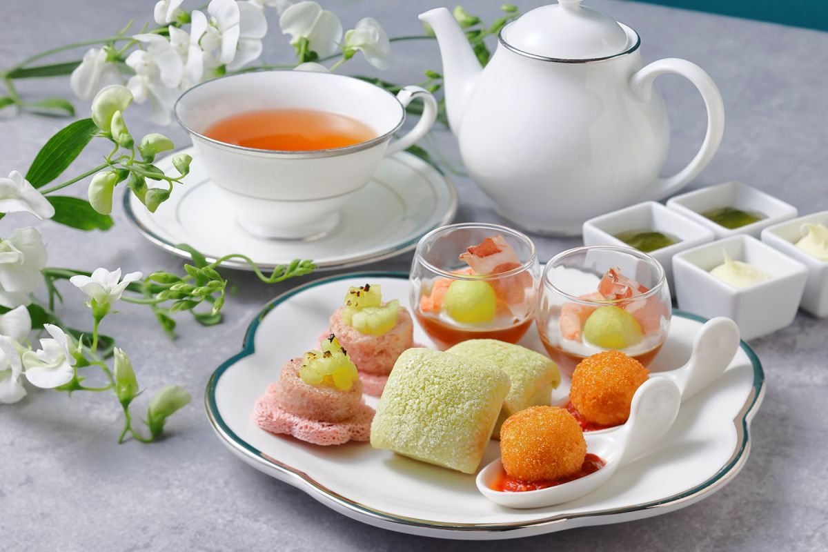 下段には、マスクメロンのさわやかな甘みを取り入れたセイボリーを展開。春らしくアレンジを加えた「生ハムと桜ブレッドのカナッペ」、メロン風味のスコーンなど、アフタヌーンティー全体にアクセントを添える品々が揃います。