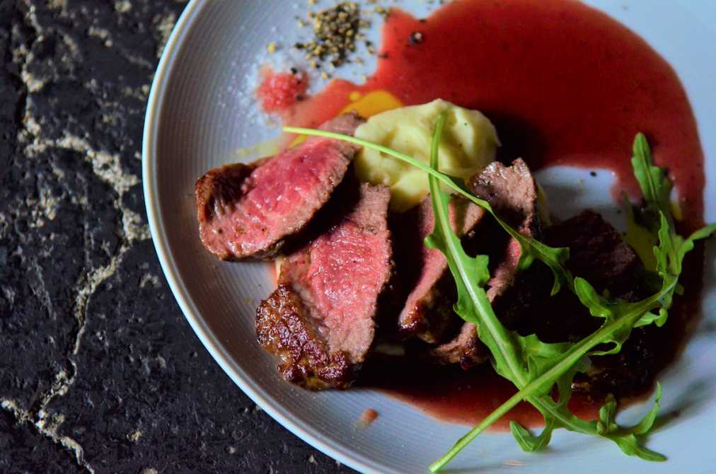 ウッディーでアメリカンなコテージを思わせるカフェのご飯といえば、やっぱりお肉!写真は霜降り牛を贅沢に焼いた「霜降り牛のタリアータ~黒胡椒とハーブのソース~」(1680円)。