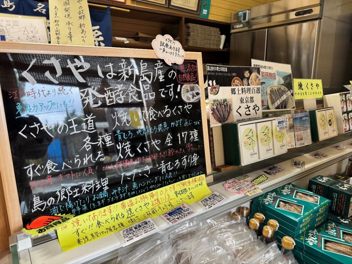 菊孫商店は創業が明治34年の老舗店。無添加にこだわり、代々受け継がれた伝統の味と香りが自慢です。匂いが苦手な方やはじめての方でも食べやすい醤油漬けもおすすめです。せっかく新島に来たなら、くさやチャレンジしてみては?
