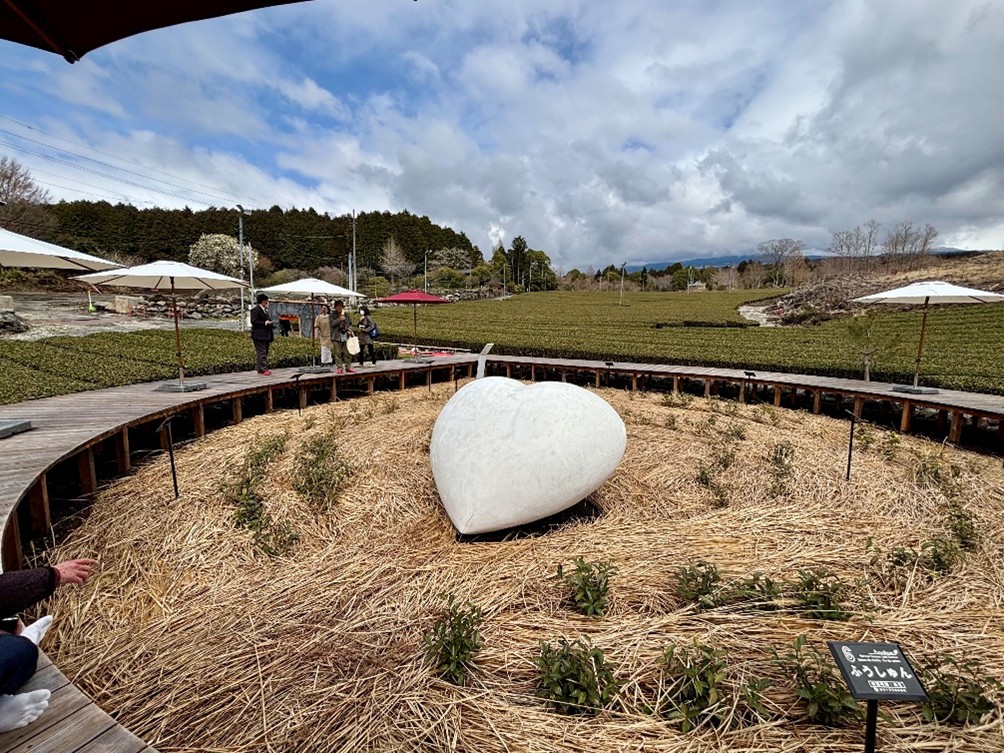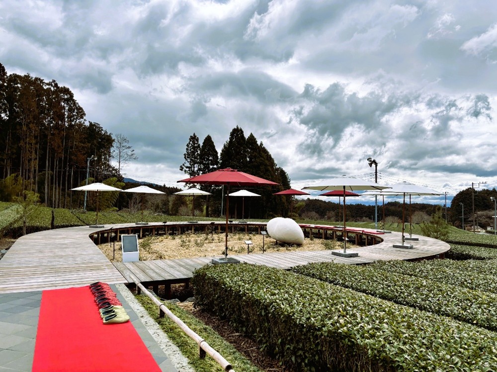 デッキは円形になっており、中心部分は茶園試験場として約10種類の茶品種が植栽されています。あと5年ほどでデッキと同じほどの高さに成長し、まるで茶畑を歩いているかのような想定をされているとのこと。訪れるたびに大きくなっている、茶葉の成長も楽しみになりそう。
