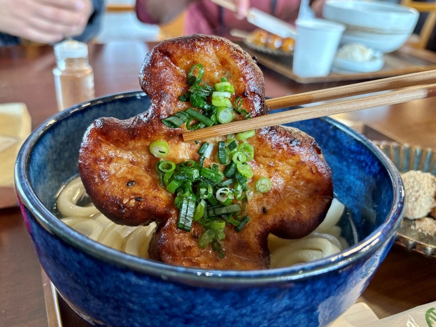 実際に食べてみると、甘いだしがうどんにマッチ!感覚はきつねうどんに似ていますが、がんもどきならではの豊かな食感と、炙ることによる香ばしさがとても美味しい。ペロッと食べてしまいました。