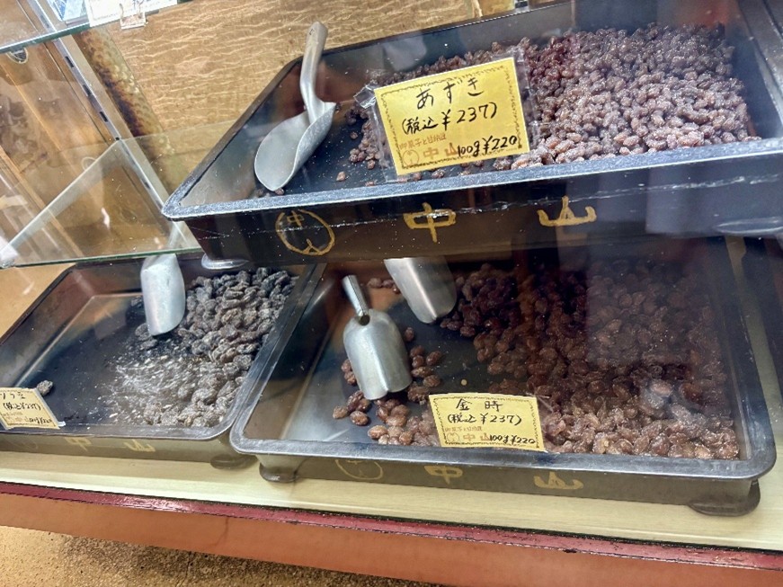 商店街のちょうど中間地点のあたりにある老舗和菓子店「中山豆店」は、甘納豆の量り売りが大人気。