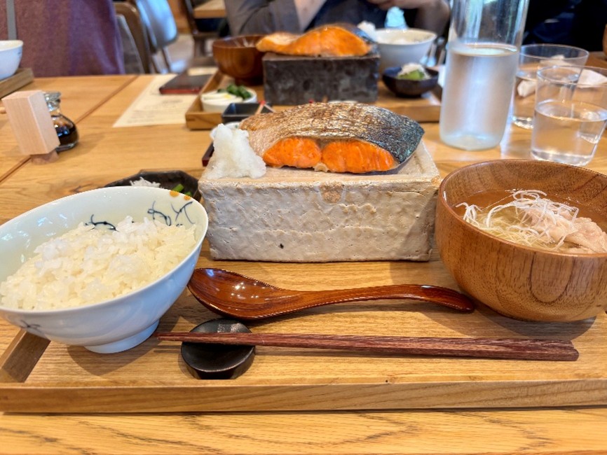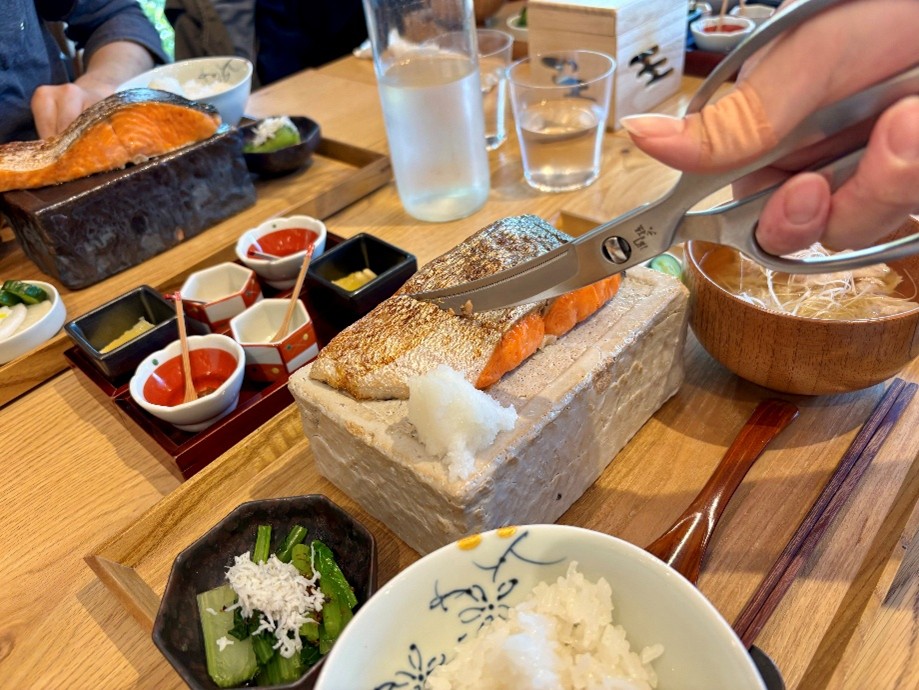 朝食は1種類のみ。大きな銀じゃけが主役の定食2750円です。 驚くのがしゃけの分厚さ。思わず声が出てしまうほど厚い鮭にテンションアップ!食べやすくするために、スタッフの方がハサミで切り分けてくれるほどです。