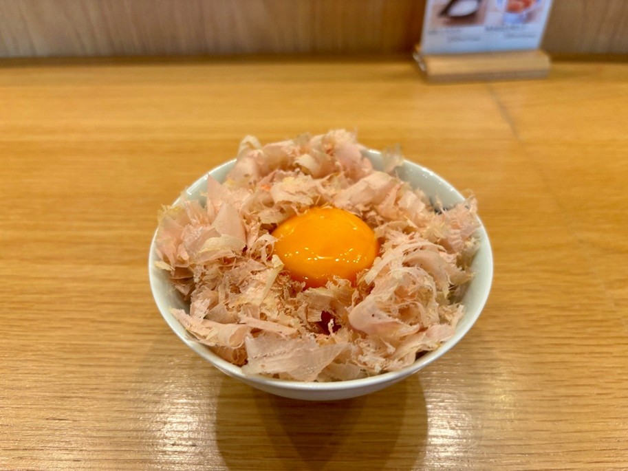 米えにしが推しているのが、「幾見卵の黄身醤油漬け」275円と削り節の組み合わせ!お腹いっぱいでもどんどん食べられます。