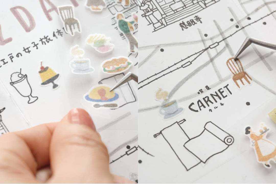 イラストを添えるのが少し大変……という方は、写真やシールに頼るのも一つの手です。特におすすめなのは、100均の文具売場にもあるアイコンシール。各スポットの雰囲気に合わせて、食べ物だけでなく「インテリア」や「窓辺の風景」といったシールも添えてみると、ノートの中にその場所の空気感が蘇ります。