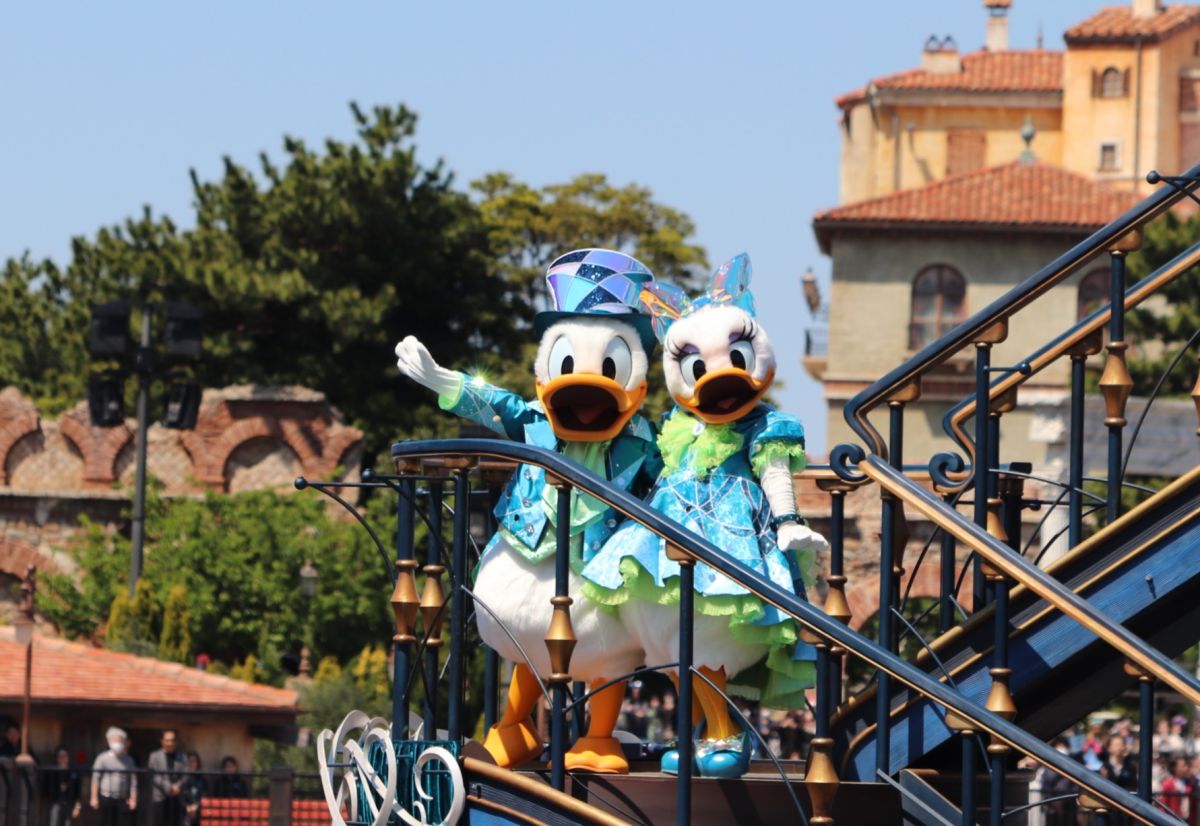 ジュビリーブルーのリボンフラッグがはためき、25周年のコスチュームに着替えたミッキーたちが登場! チップとデールの25周年コスチューム姿が見れるのはこのショーだけなので要チェックです。
