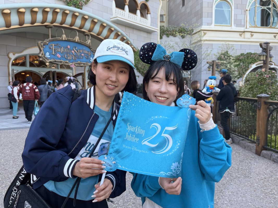 さらに、キャストの胸についているネームタグをデザインしたシールも無料でもらえます。ネームタグに自分の名前を書き込んで渡してくれるんです! キャストに「25周年のシールください!」と声をかけてみましょう。