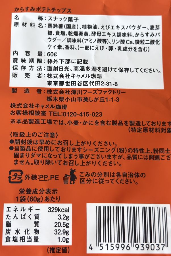 気になるカロリーは1袋(60g)あたり329kcalです。