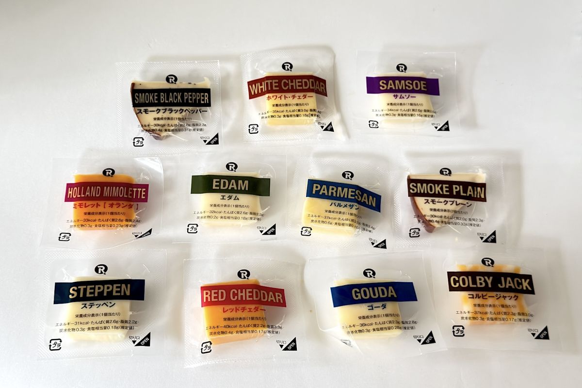 スモークブラックペッパー、ホワイト・チェダー、サムソー、ミモレット、エダム、パルメザン、スモークプレーン、ステッペン、レッドチェダー、ゴーダ、コルビージャック。