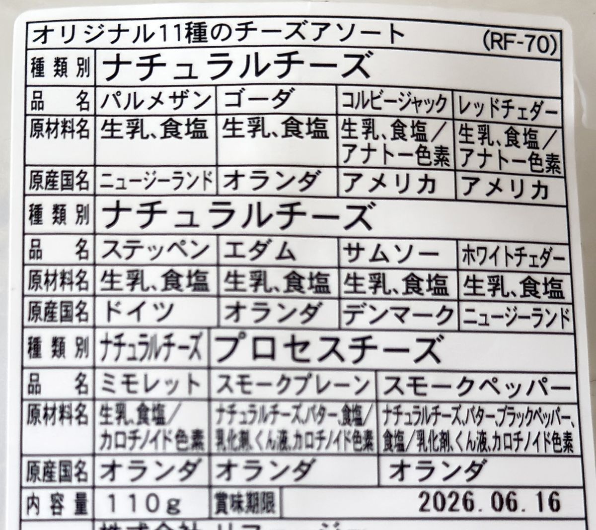 「オリジナル 11種のチーズアソート」645円はパルメザンやチェダーなど11種類のチーズの味の違いが楽しめるアソートパックです。