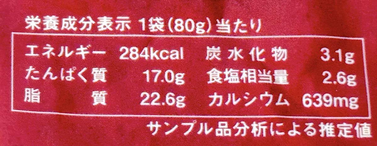 カロリーは1袋(80g)あたり284kcal。1袋の中に11個入っていたので、1個あたりは26kcal前後です。