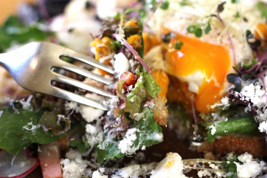 「本日のベジタブル スモーブロー」は、季節の野菜とベーコン、かぼちゃのピューレに温泉卵をトッピング。パルミジャーノと、白いパウダーはオリーブオイルを燻製にしたもの!口に含むとふわっとほどけ、ほんのり香りを楽しめます。