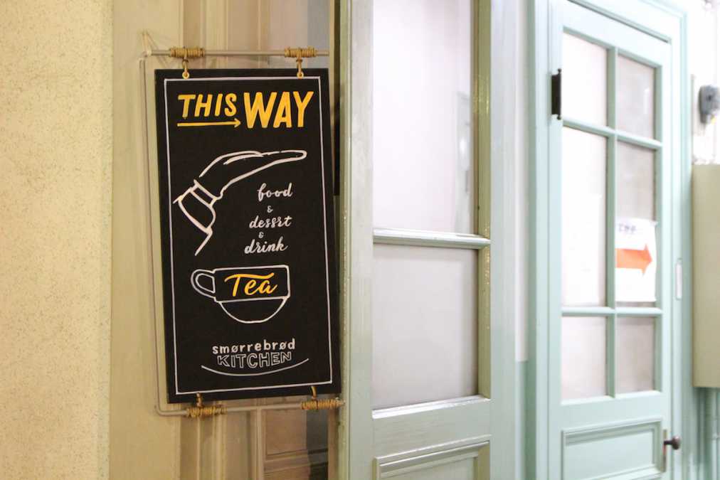 「スモーブローキッチン ナカノシマ」は、そんな中央ホールから右の通りへと抜けた先にあります。ヨーロッパの街角にありそうな、素敵な案内看板が目印!