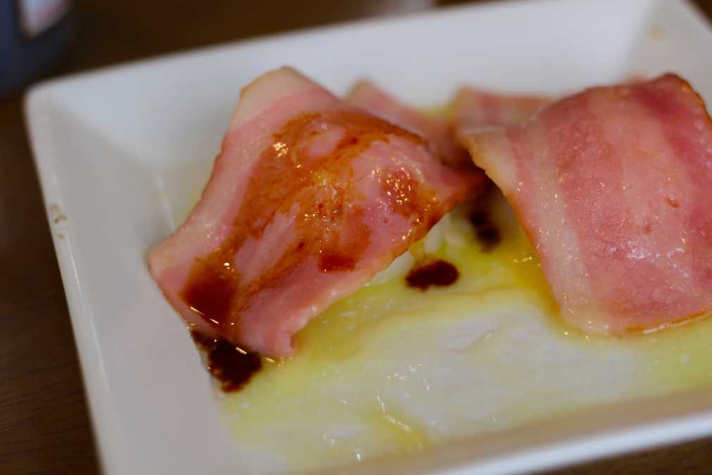 プレーンな白玉にチーズとバター、ベーコンをトッピングした「ベーコンチーズバター」は、軽食にぴったり。ベーコンは厚めにスライスされていて食べごたえ抜群!