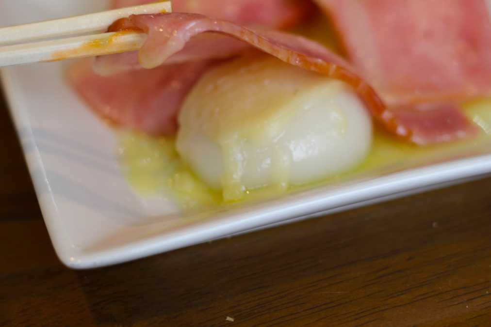 醤油をちょい足しした「ベーコンチーズバター」白玉は、味に深みがプラスされ、震えるおいしさに!