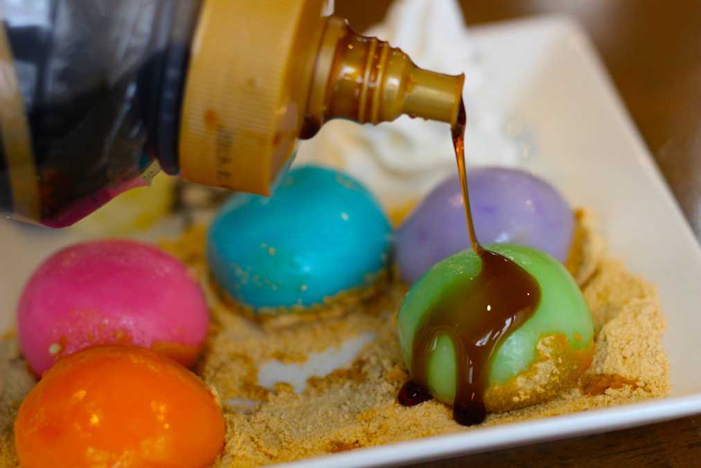 「しらたま+」の白玉は、醤油や黒みつを自由にトッピングできるのもうれしいポイント。「カラフル白玉」には黒蜜をちょい足しして濃厚な味わいを堪能すべし!