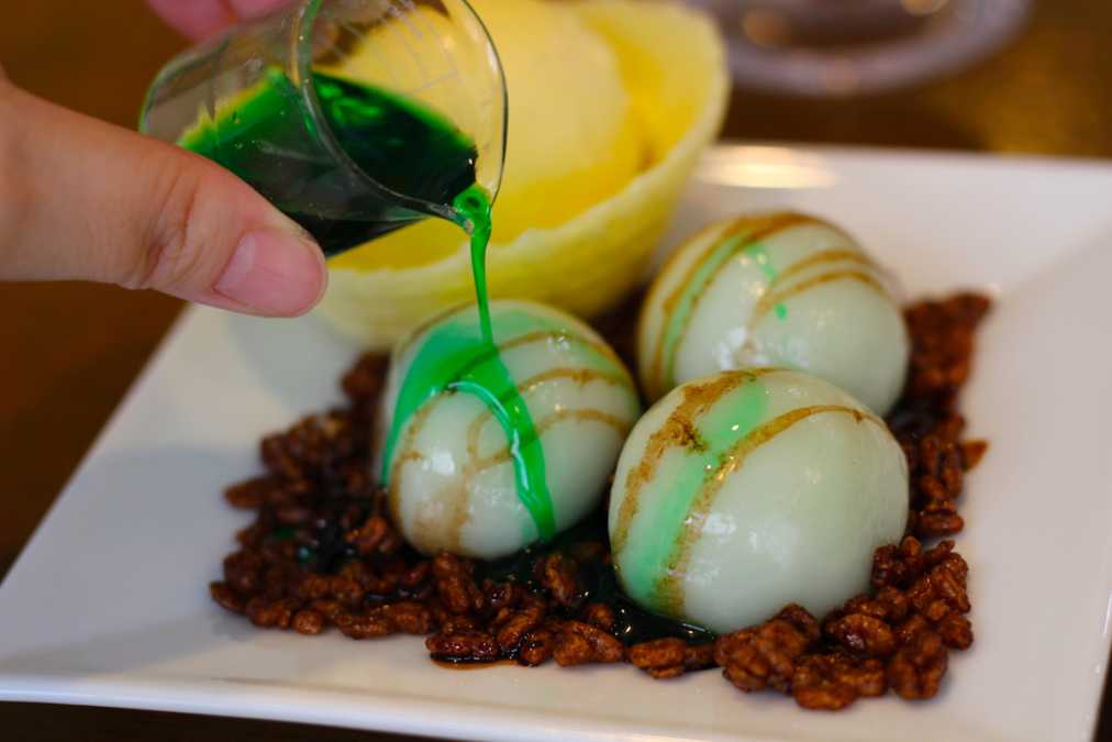 ミントを練りこんで作った白玉に、ミントフレーバーシロップをかけて味わう「ミント白玉」は、下に敷いたチョコの甘さとミントのスッキリ感が絶妙。