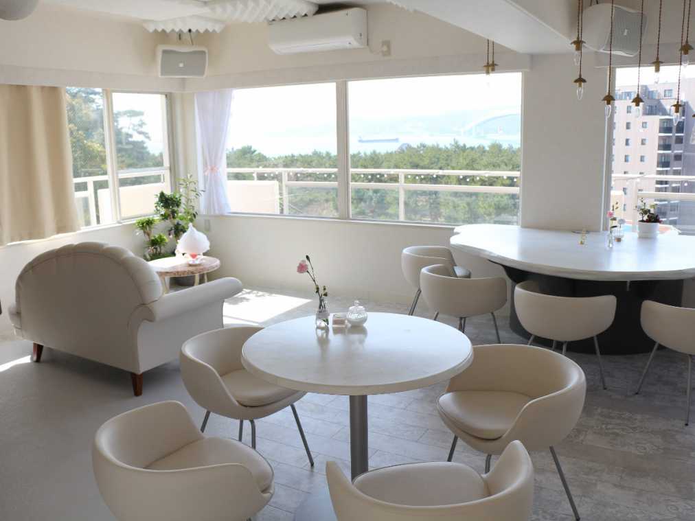 マンション6階のドアを開けると、店内は天井、床、壁など、すべてが白!丸いフォルムのテーブルと椅子は、まるで雲のよう。空を連想するようなふんわりとした雰囲気のカフェは、大きな窓から木々の緑と青い海、「明石海峡大橋」も一望できます。