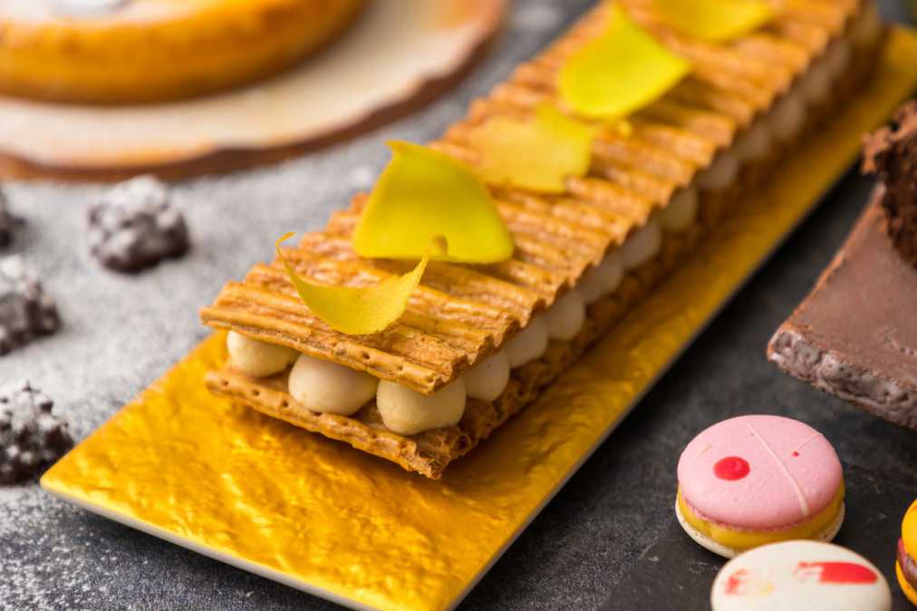 また、「春のルバーブ&レモンミルフィーユ」は、甘酸っぱいルバーブのコンポートとレモン風味のクリームをサクサクのミルフィーユ生地で挟んだ、さっぱりとした爽やかな甘さとミルフィーユの口当たりが最高。周りにあるバニラチェリーマカロンやパッションフルーツマカロンももちろん食べられますよ!