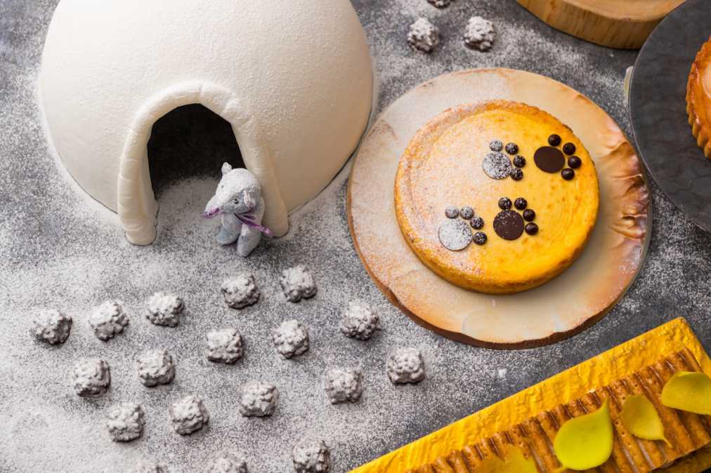 コンラッドベアの旅は、冬眠から目覚めたベアが洞穴から出てくるところから始まります。ココナッツの雪の上にベアの足跡が残る「ココナッツ足跡カップケーキ」は、軽いシフォンケーキ。
