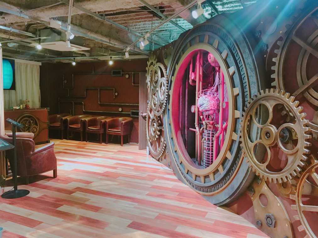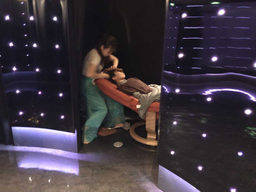 こちらは「眠りの時空旅行」がコンセプトのフロア。個室の一つひとつがタイムマシンという設定です。このタイムマシンに乗れば、1時間の施術で長年の頭皮のコリが解消され、若返ったように頭が冴えわたるのだそう。