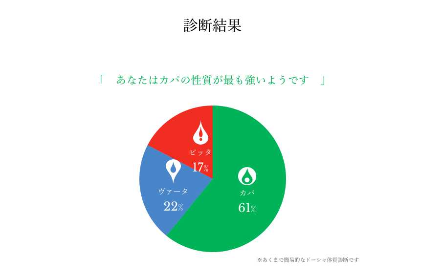 ちなみに筆者のドーシャは現在カパが61%も!のんびりリラックスをすることを何より好み、“むくみが出やすい”との診断。その通りです…。