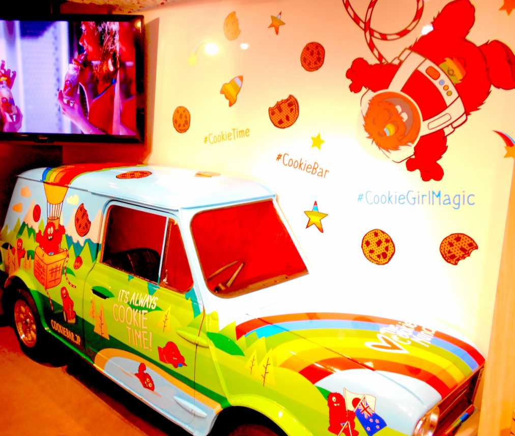 店内にはマスコットキャラクターの「クッキーマンチャー」がいっぱい。カラフルな車や壁に描かれた「クッキーマンチャー」と一緒に商品の写真を撮れば、インスタ映えは確実!