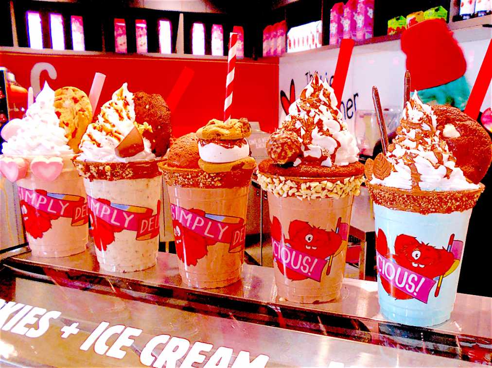 こちらがフォトジェニック感満載の看板メニュー「フリークシェイク」(1サイズ1000円)。左からハラジュクシェイク、塩キャラメルシェイク、チョコレートスモアシェイク、ヌテラシェイク、チョコミントシェイクの5種類です。シェイクの上にはホイップクリーム、チョコレート、マシュマロ、クッキーなどがこれでもかというほど盛られています。