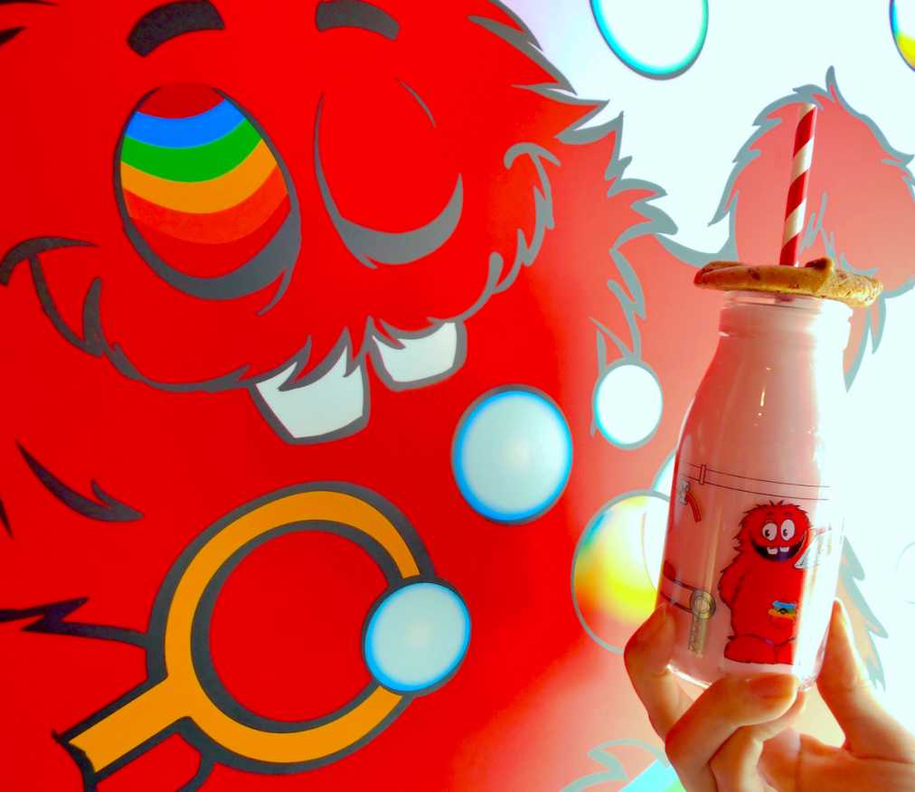 ミルクボトルコンボのフレーバーは、ミルク、ストロベリー、チョコレート、コーヒーの4種類あり、なんと無料でミルクをお代わりすることもできるんです!クッキーマンチャーの絵が描かれたボトルは、記念に持ち帰ることもできます。