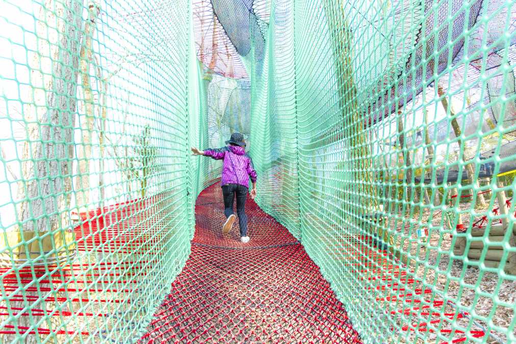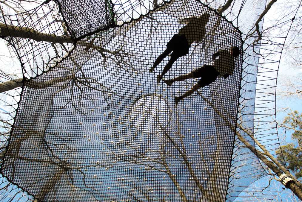 はじめにスタッフから説明を受けて、あとは自由に遊んでOK。自然の樹木を活かして造られていて、地上6~10mに網が張り巡らされています。黒い網の四角のスペースが遊び場で計12面あり、赤い網の通路で結ばれています。