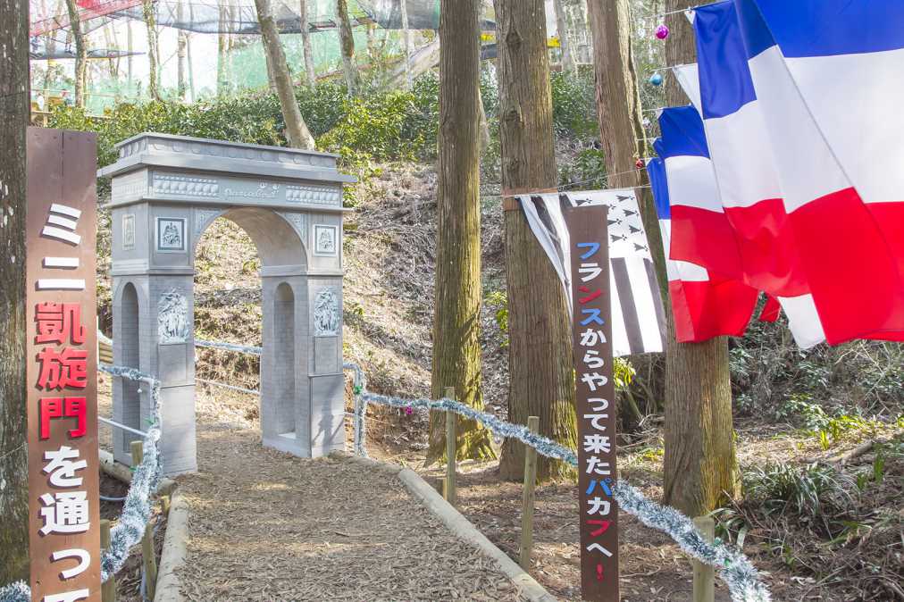 準備ができたら入口へ。ミニ凱旋門やトリコロールのフランス国旗がお出迎え。
