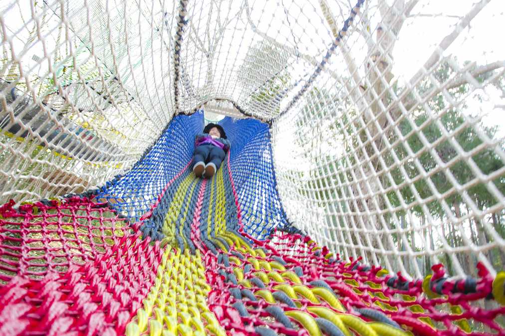 外側から見ると雪玉で作った富士山のように見える場所が。こちらは唯一、運動禁止のヒーリングスペース。網の上に寝転がると、ゆらゆら、ふわふわハンモックのよう。賑やかに遊ぶ声や野鳥のさえずりがBGMになり、心が安らぎます。