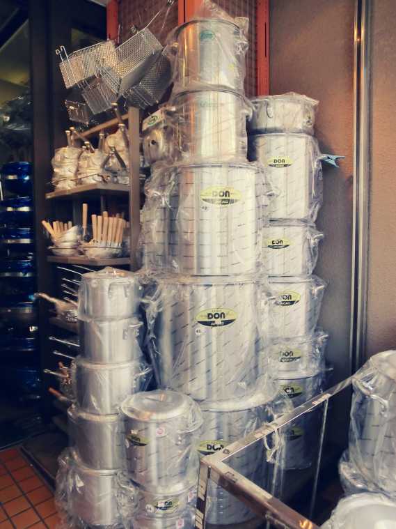 まず入口で目に入るのは鍋、鍋、鍋!見上げると口がポカンと空いてしまうほど、高く山積みにされています。これってラーメン屋さんの厨房で見かけるスープを仕込む業務用!?特大サイズのプロの道具に圧倒されます!