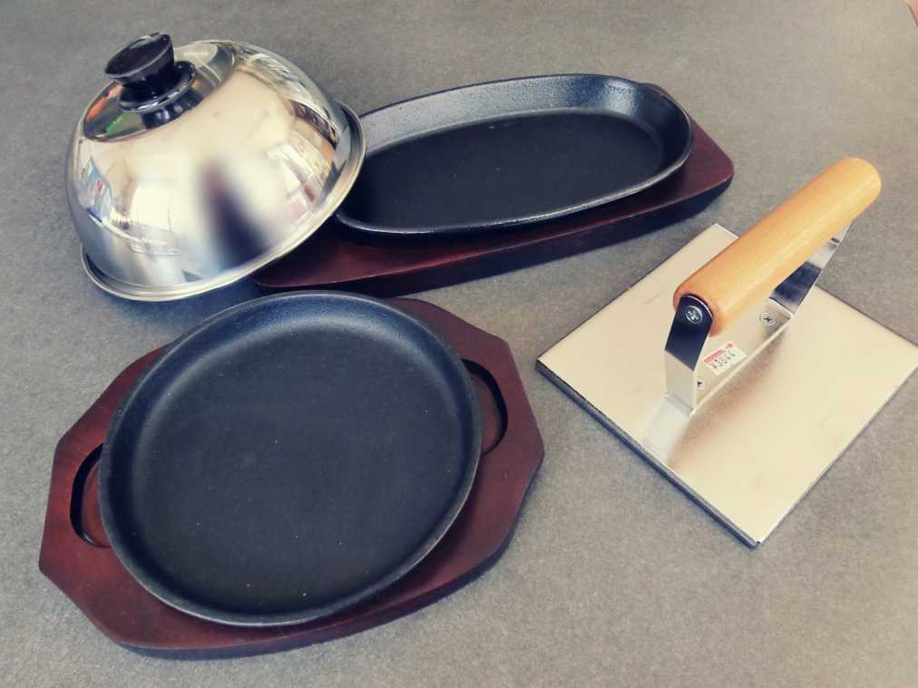 肉好き女子のハートをつかむアイテム発見。ジュージュー熱々のハンバーグやステーキをのせる鉄板プレートと熱さを逃さないステーキカバー。写真右の取っ手がついた天板はずっしり重い肉押さえ。肉がカリッと美しく焼けるプロ専用の道具です。